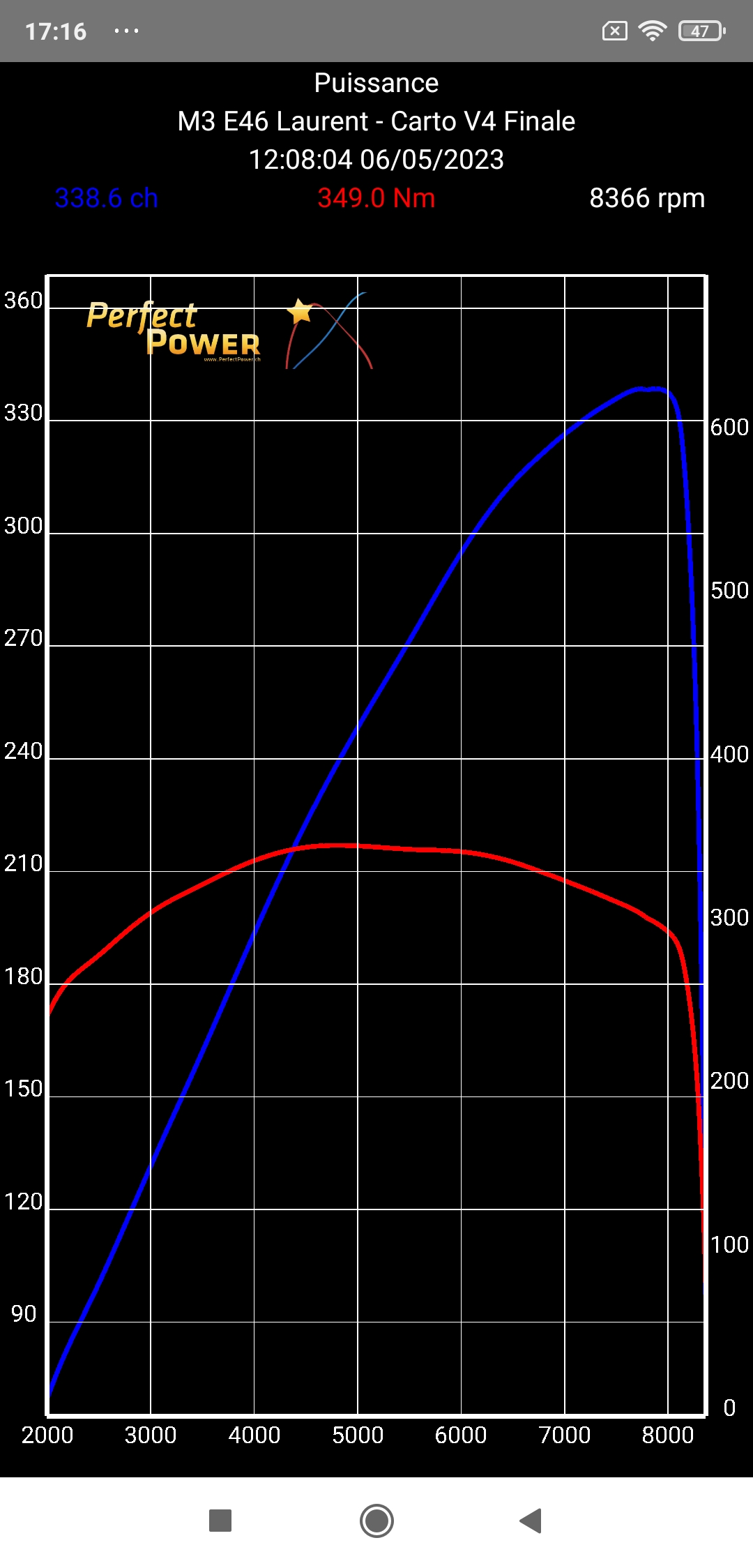Note 3: Honnêtement la forme des courbes est non seulement superbe, mais elle est aussi extrêmement proche de celles du S54B32 de référence BMW, avec la Pmax atteinte très exactement au même régime de 7900 rpm et le Cmax atteint presque exactement aussi au même régime (4800 rpm S54B32 M3 Laurent VS 4900 rpm S54B32 BMW), mais "nos" courbes sont encore plus remplies dues à notre travail Vincent et moi où nous avons donné au S54B32 de la M3 de Laurent son rendement optimal à tous les régimes...