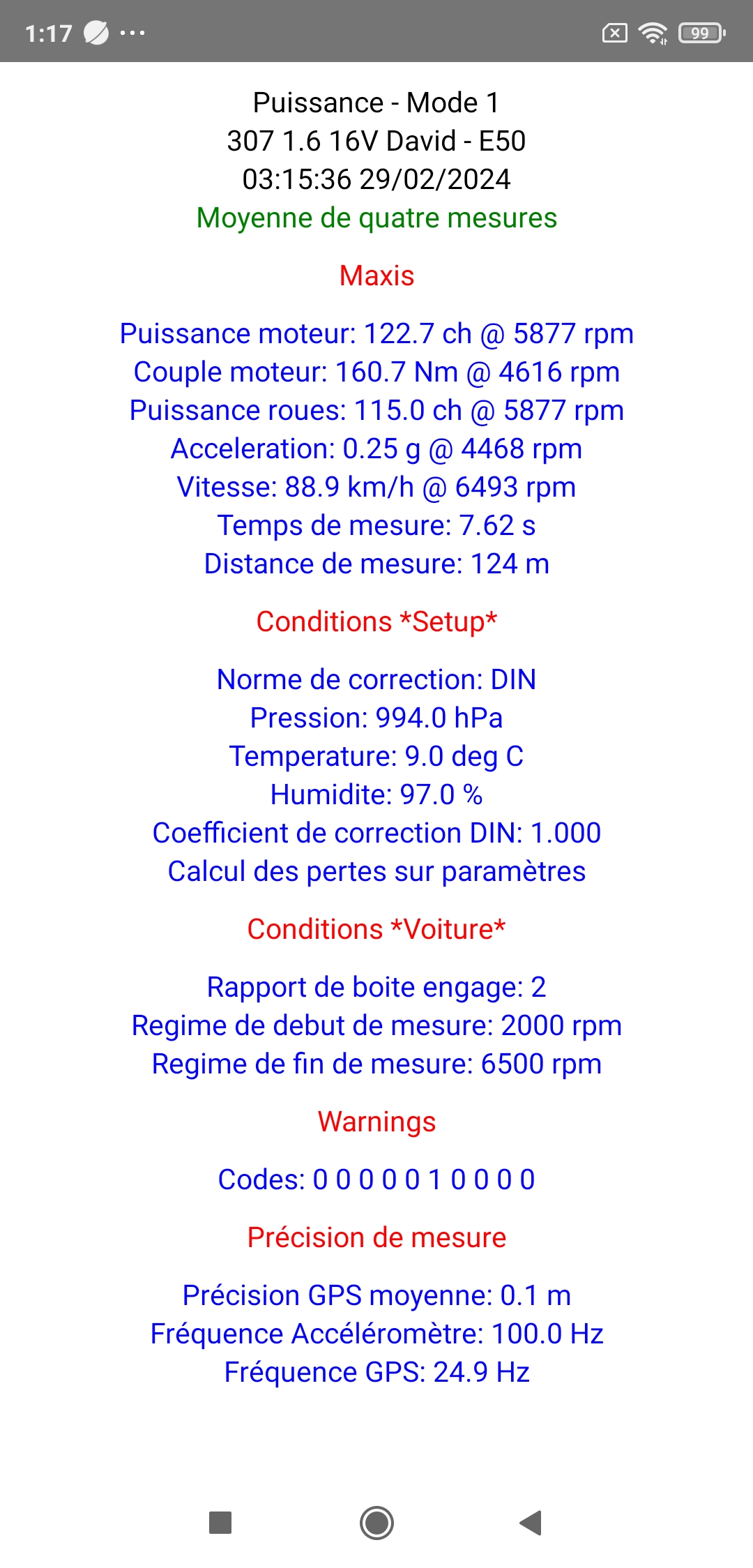 ==> Précision du résultat officiel moyenné sur la totalité des 4 mesures = 0,5 / 4 = 0,125% soit 0,2 ch