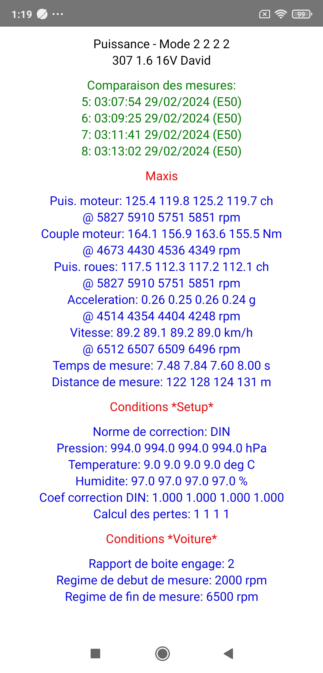 - Amplitude des puissances maxi dans un même sens <= 1% soit 1,2 ch (0,9 ch sens 1 et sens 2)