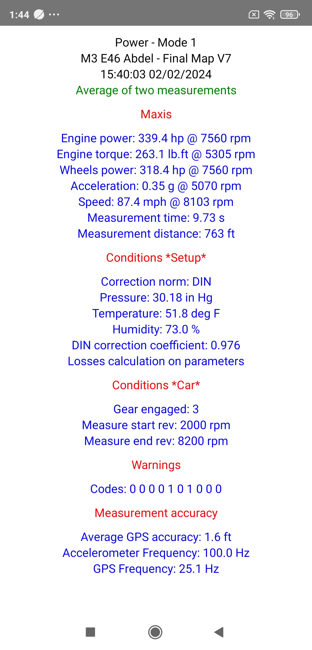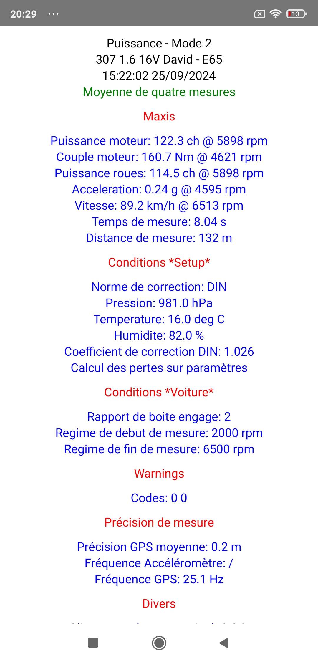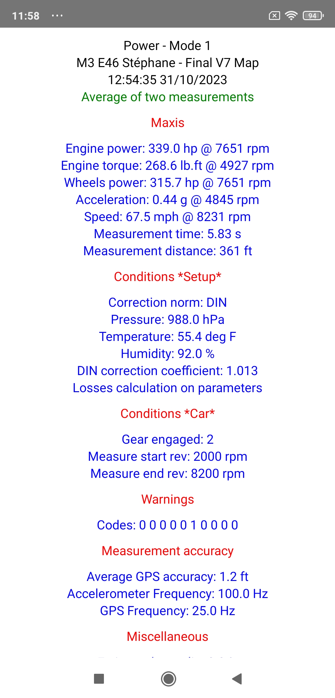 1) Power / Mode 1 only: Addition in the power results sheets of the info "Speed at max rev" and an explanatory text on the "Max speed correction" function ideal in the event of poor GPS reception or failure of this one in this mode (indeed, 95% of the measurement accuracy is made by the accelerometer in this mode)