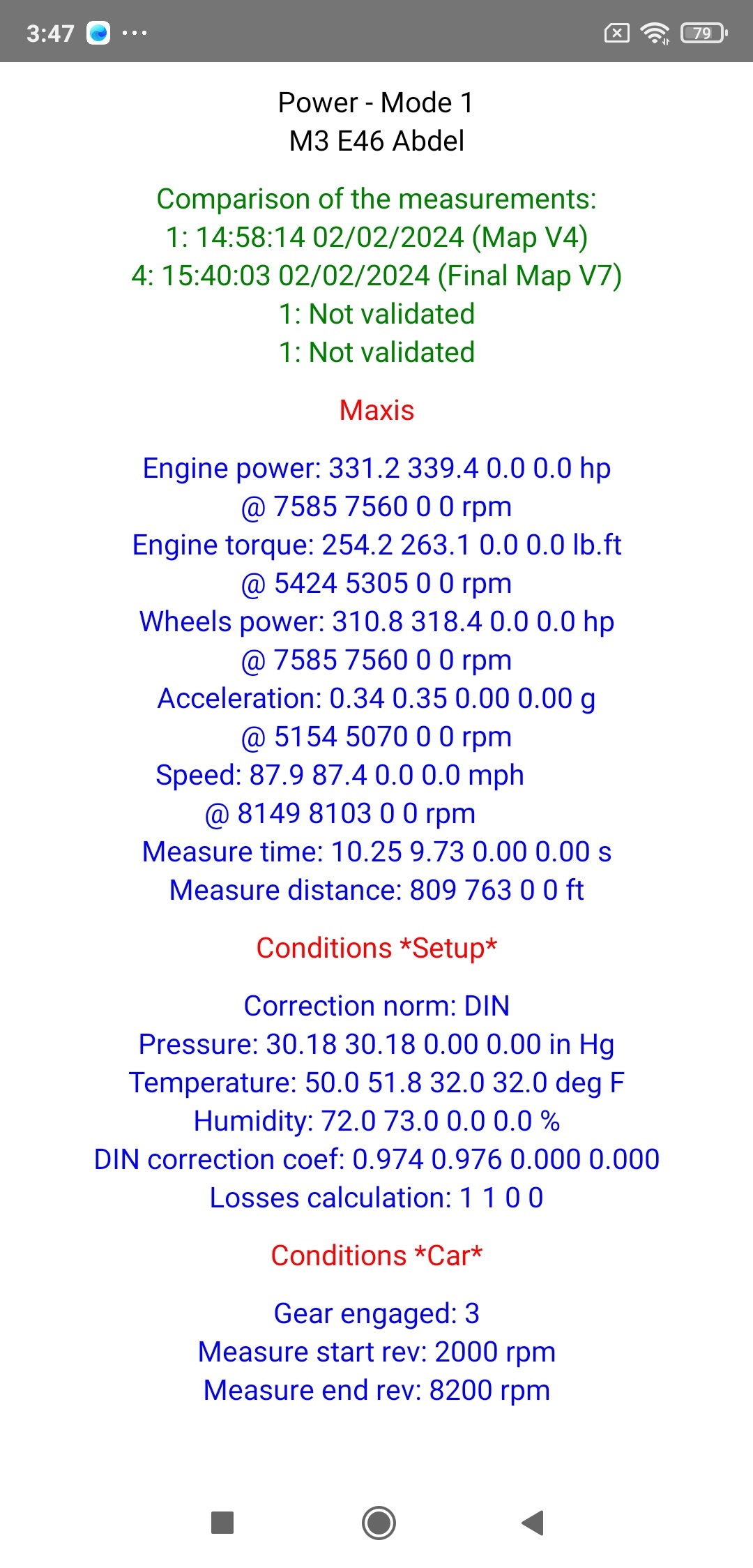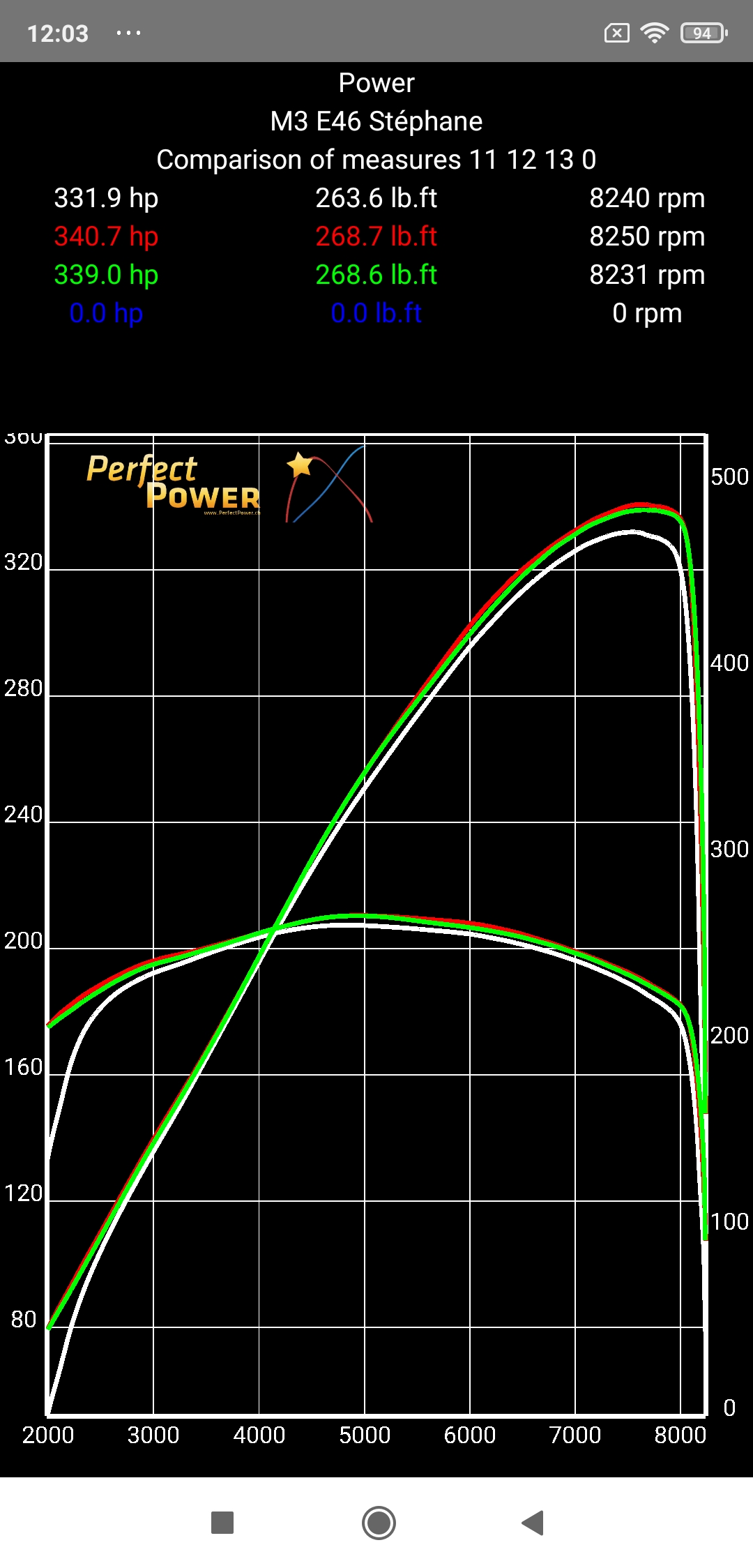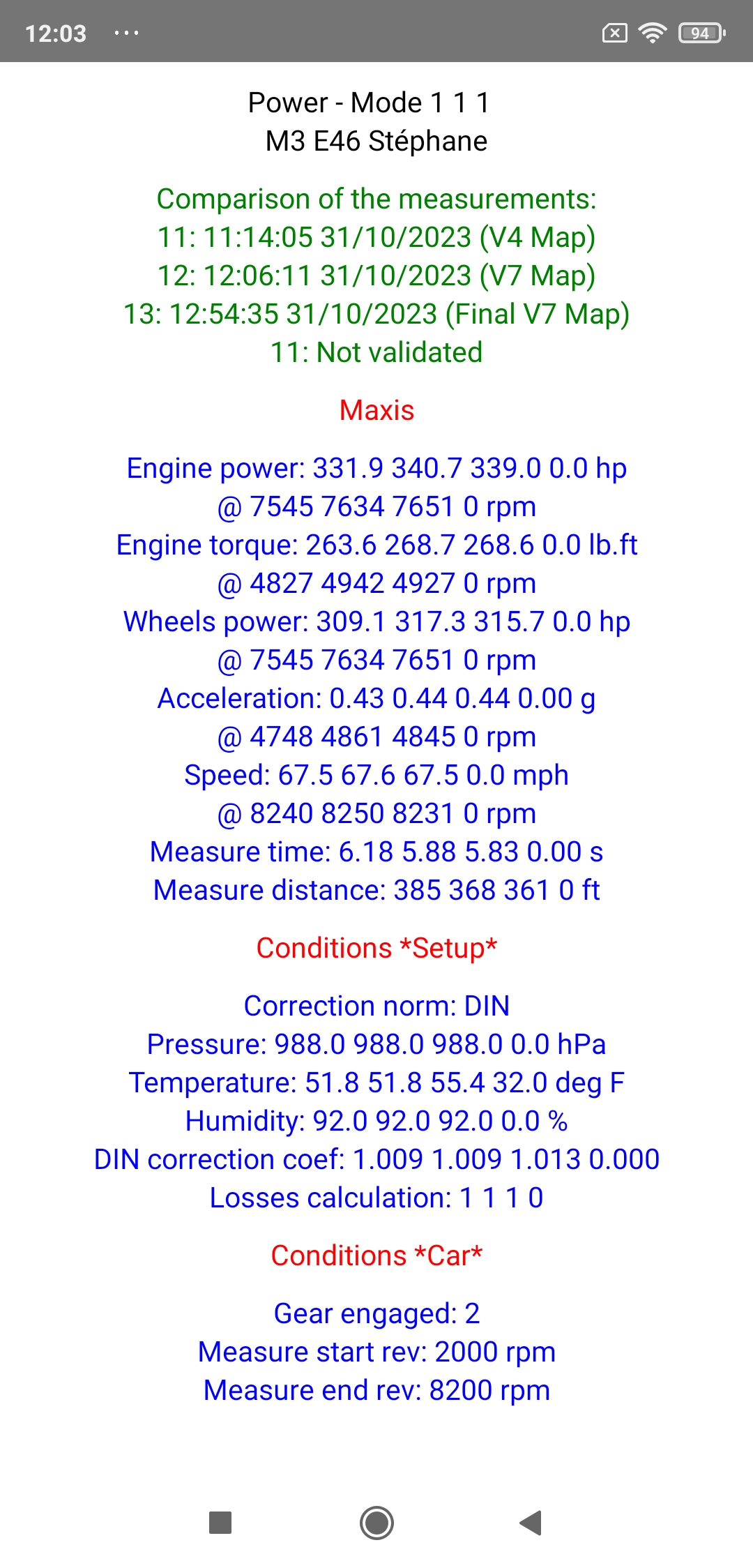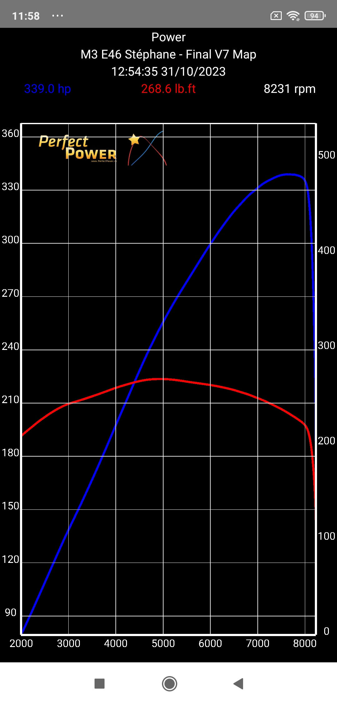 Note: Vincent and I would like to emphasize the excellent results of this M3 E46 only equipped with a Venturi effect airbox that we had never tested and of which we therefore do not know the gain (the injectors and the pump are mainly an adaptation necessary for the ethanol conversion), and having an engine totaling... 260,000 km (admittedly redone at 180,000 km)! Knowing that the very best BMW M3 E46s come out around 335 hp 100% original and that the average is rather around 325, we can conclude as I said with humor (AND caricature!) to Stephane its owner that or it has an exceptional engine and the airbox brings nothing, or it has a standard engine and the airbox brings a phenomenal gain!