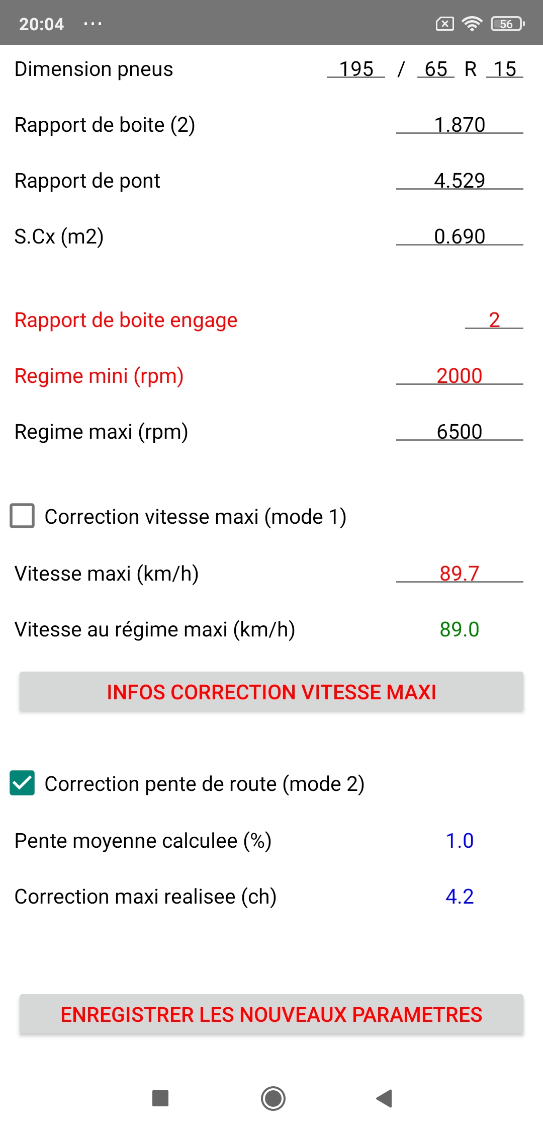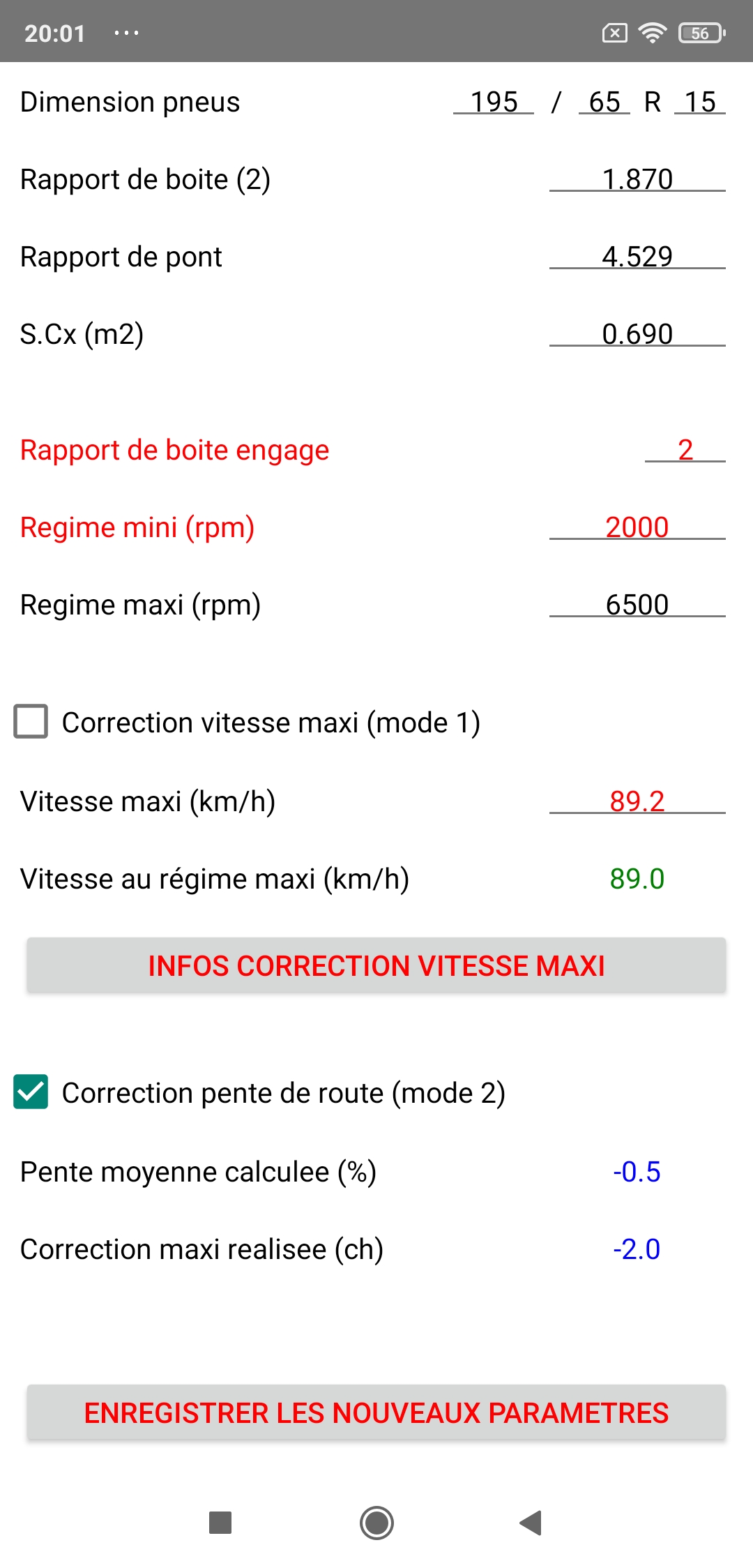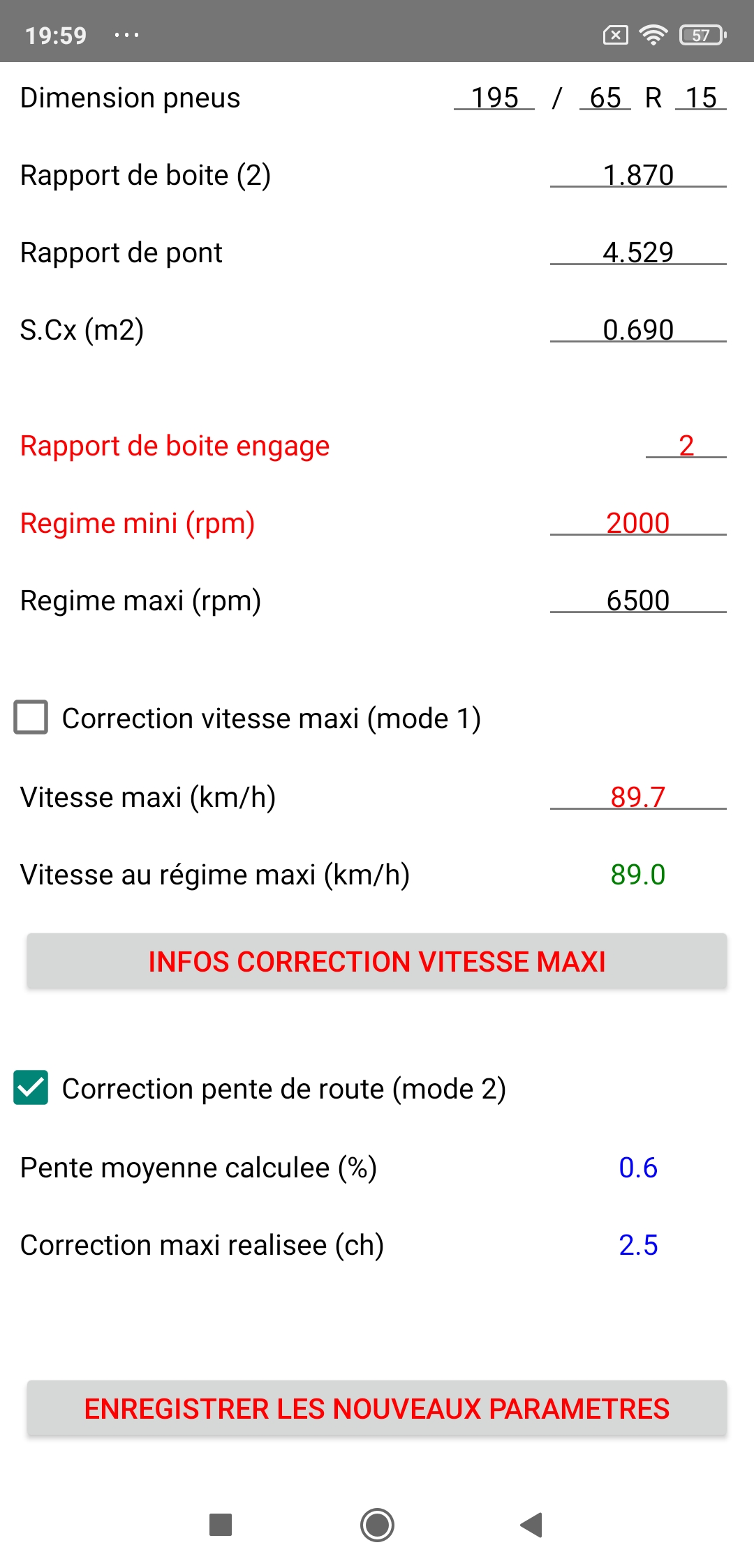 However, be careful, you must ALWAYS remember to save any modification (car parameters, max speed correction, road slope correction) that you wish to keep via the "Register the new parameters" button BEFORE leaving the results sheet, thank you. This function may however also become automatic in the future if this choice was preferred by users.