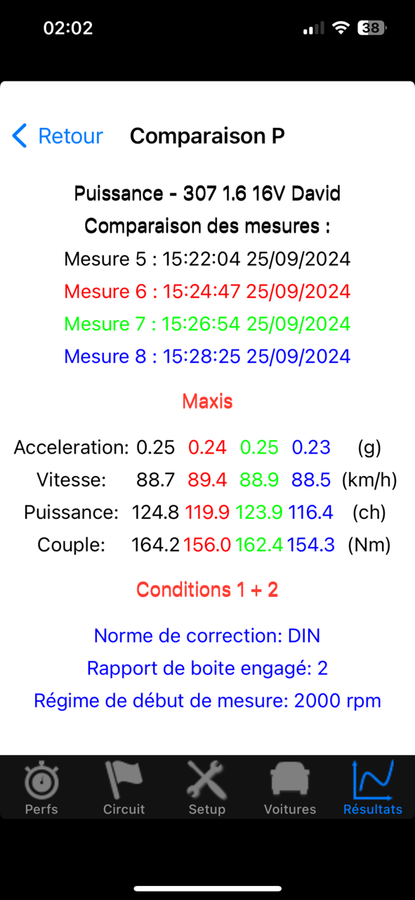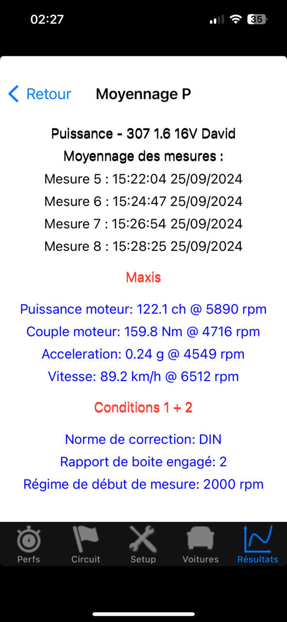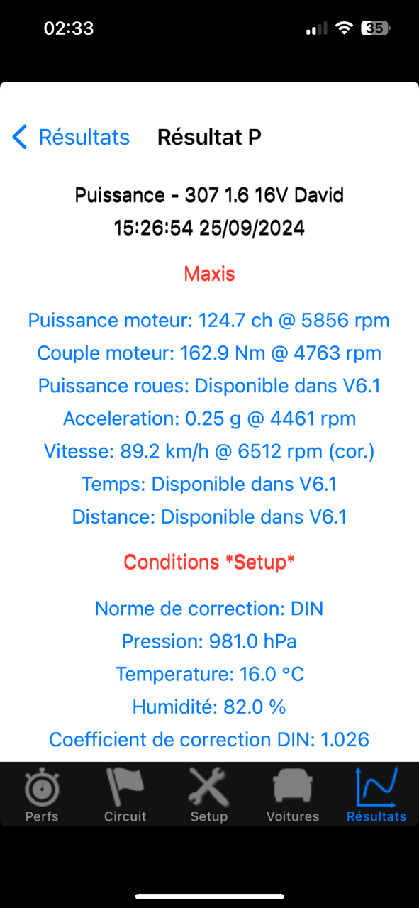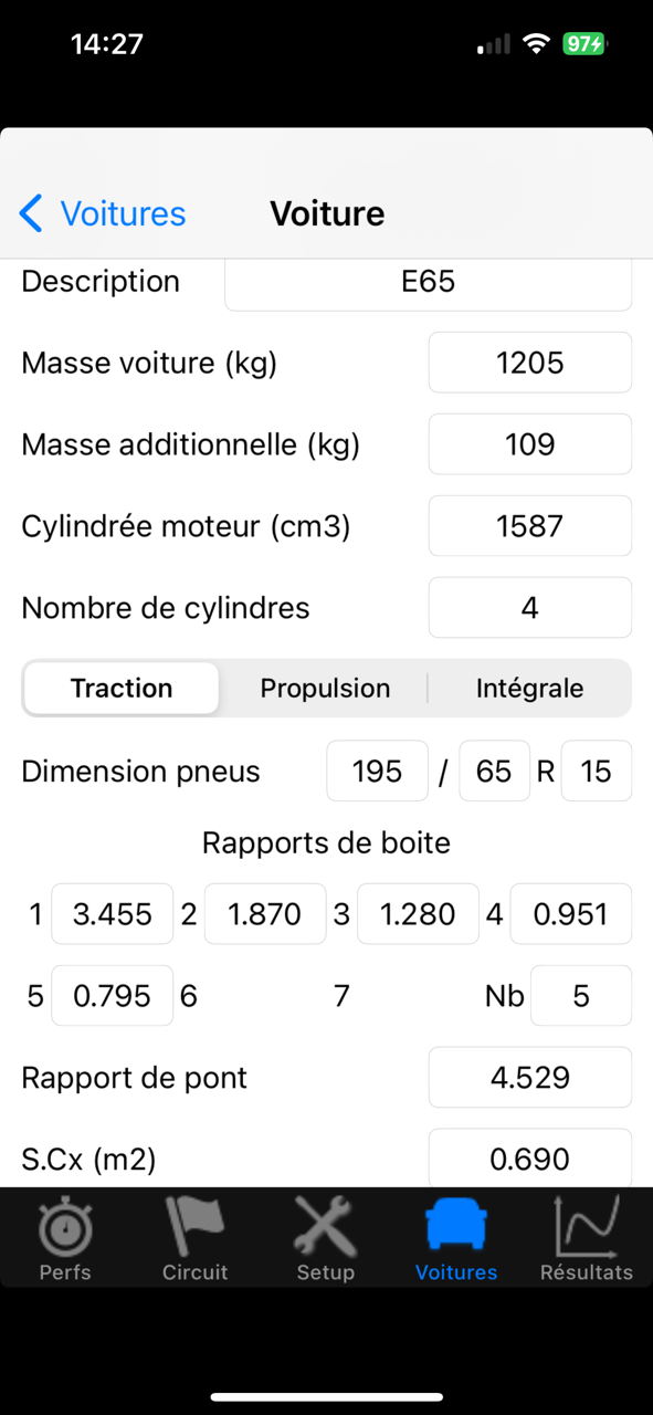 However, be careful, you must ALWAYS remember to save any modification (car parameters, max speed correction, road slope correction) that you wish to keep via the "Register the new parameters" button BEFORE leaving the results sheet, thank you. This function may however also become automatic in the future if this choice was preferred by users.
