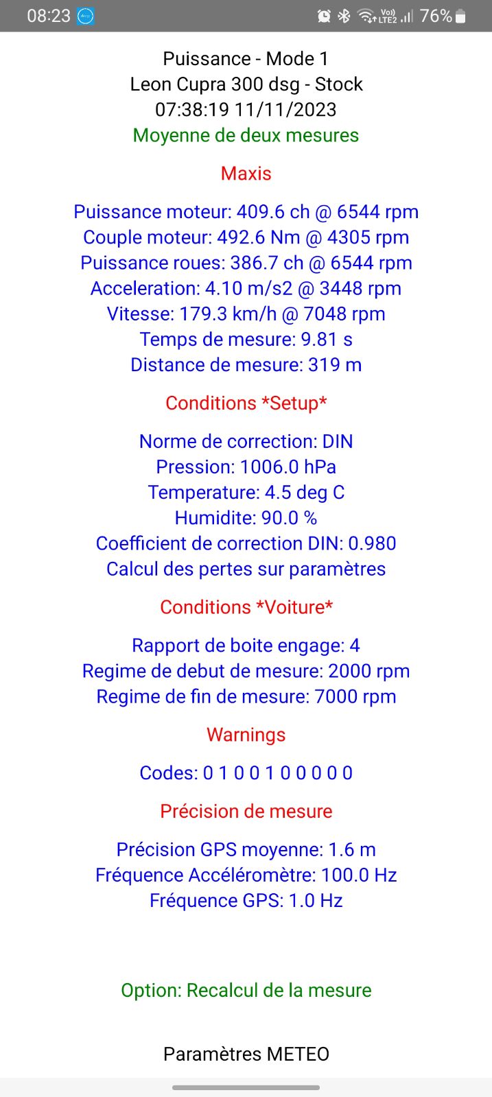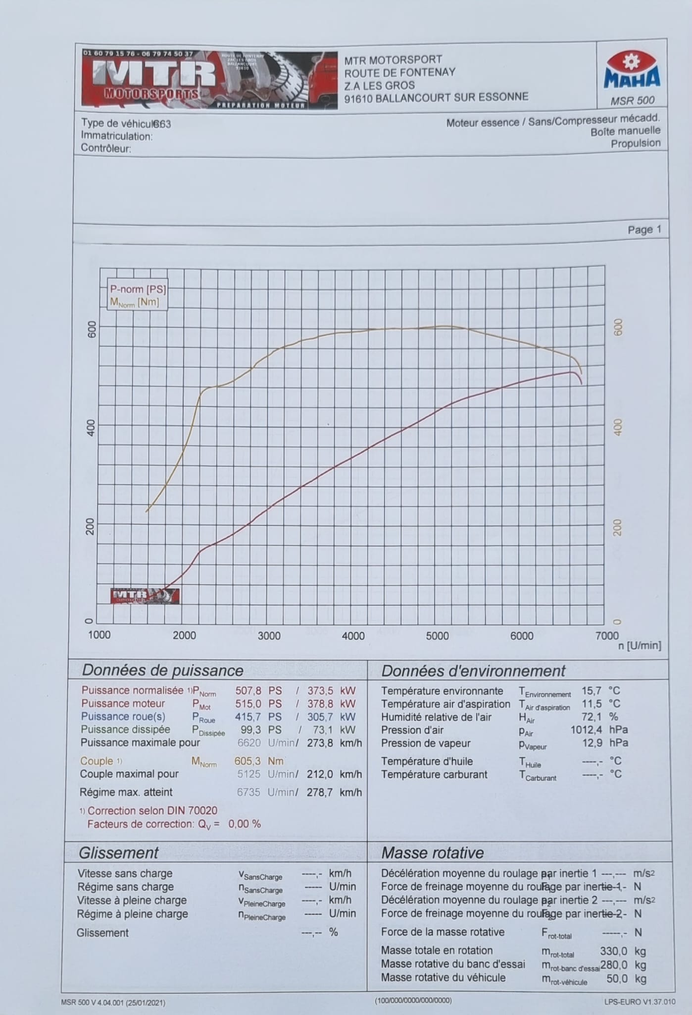 - Amplitude des puissances maxi sur les mesures d'un même sens <= 1% soit 5,1 ch (0,5 ch sens 1 et 3,4 ch sens 2)