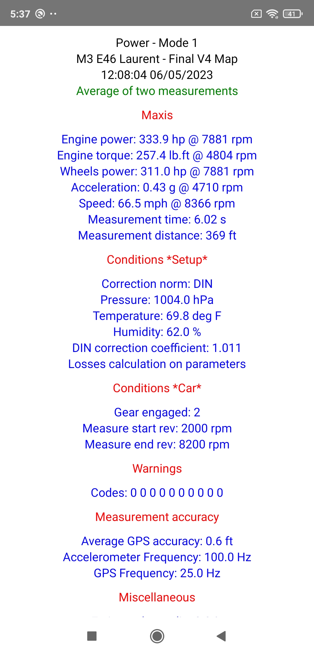 Note: This tuning session was the 1st carried out with the RaceBox Mini (after years with the already excellent SkyPro XGPS 160), and all the measurements carried out were of an absolutely flawless accuracy (even including on one measurement the detection of a drop of 5 hp between 7300 and 8200 rpm due to a knocking detection on two cylinders generating a sharp drop in ignition advance on these two cylinders which should result in a calculated overall power drop of... 5 hp!), allowing the optimal tuning of this M3 E46 in a record time, even shorter than this we would have taken on dyno if we take into account the (significant!) time of complete installation of the car on the dyno (centering, strapping, rev calibration, eventual calibration of the brake level, etc...): very frankly, with the sole exception of the particular case of extreme cars that can not be driven on road, using a chassis dynamometer in 2023 or later when you can use the PerfectPower + RaceBox couple being even more efficient and incomparably cheaper is no longer justified, whether for a simple power & torque measurement or for a complete adjustment, and it is obvious that all true enthusiasts and connoisseurs will understand this perfectly...