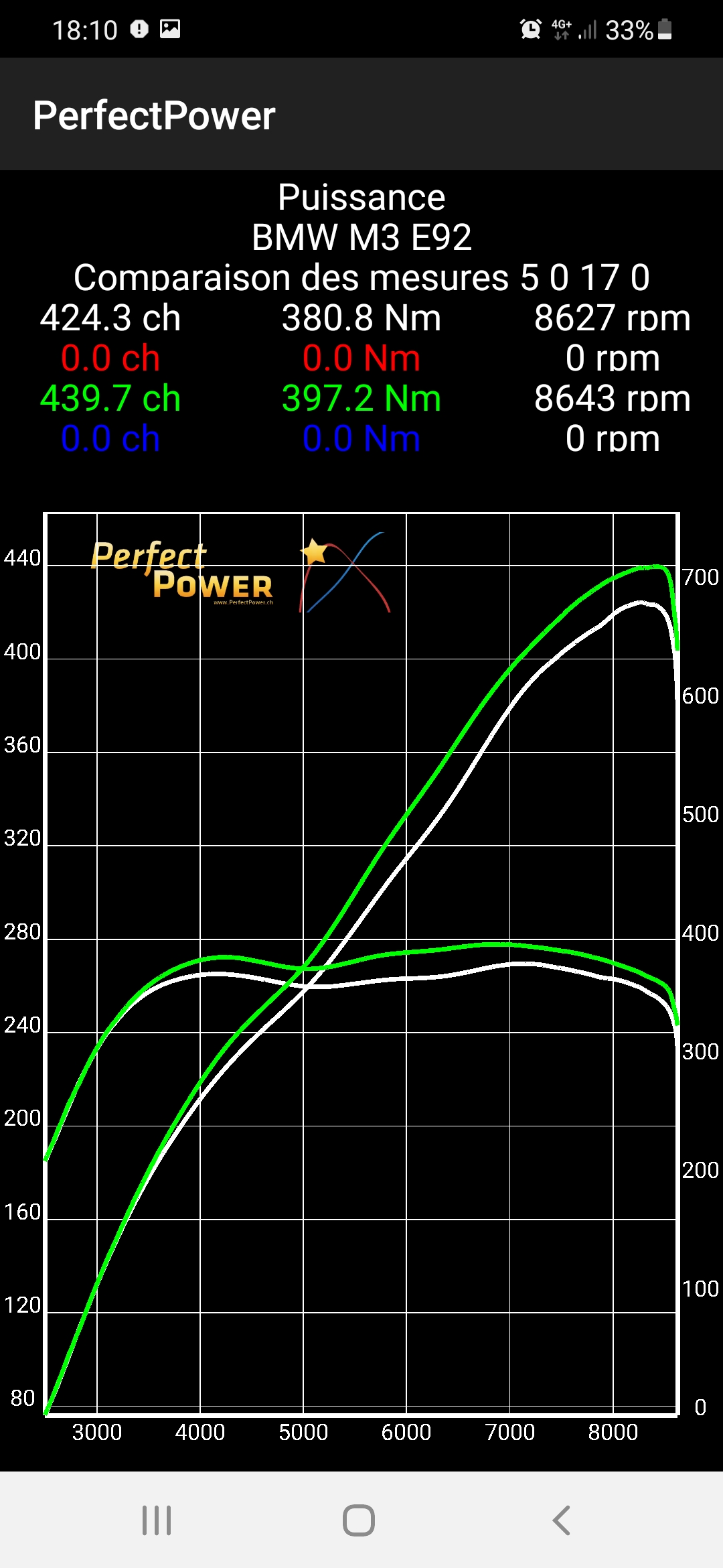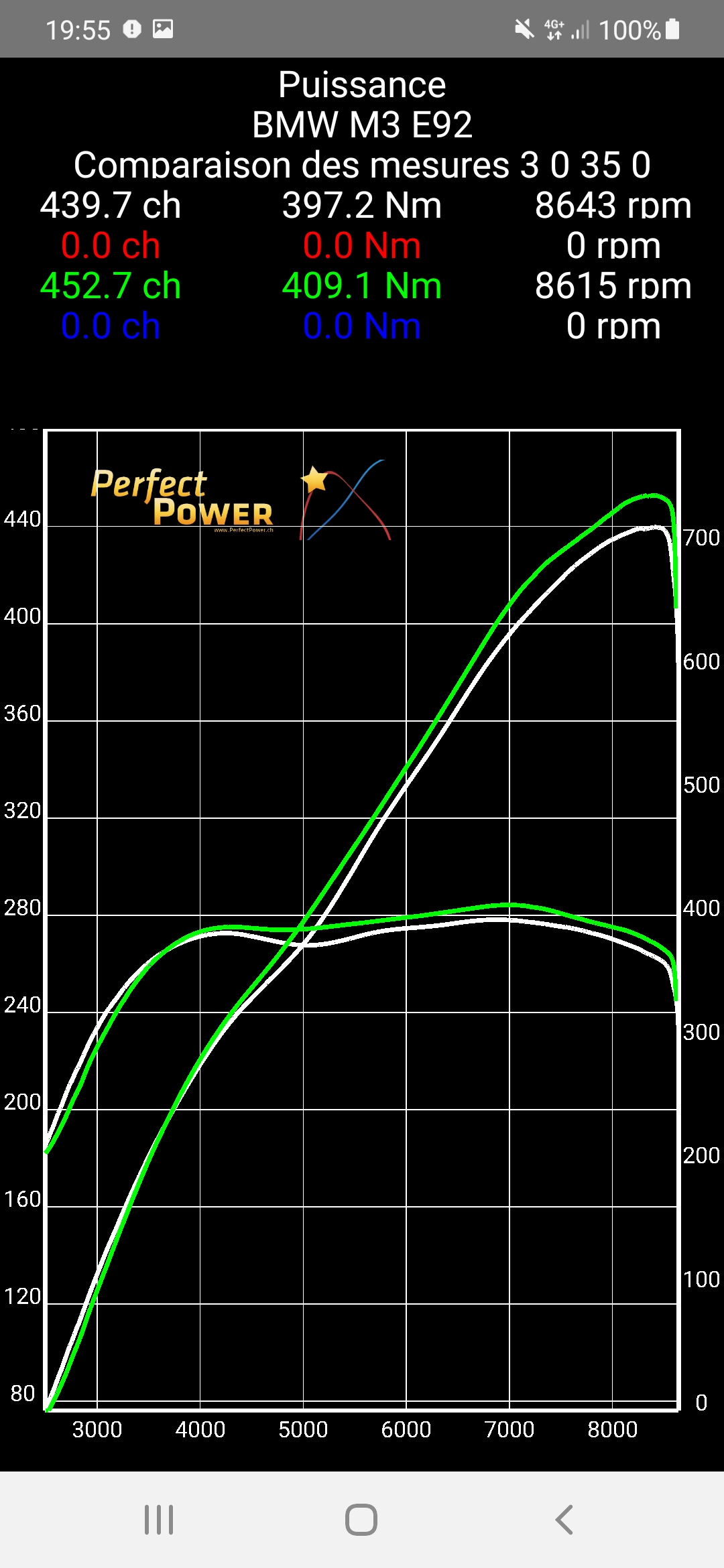 Note: As explained before, we noted in our measurements in parallel with the two phones a perfect stability of the results and the accuracy of the curves at all points with the Xiaomi MI 8, when it happened that measurements had abnormal variations (especially at high revs) with the Samsung Galaxy A10, and the only reason for this is the difference in accelerometer quality between the two phones since the GPS information came in both cases from a RaceBox Mini, and this is why we can ONLY make official the results obtained with the Xiaomi MI 8, i.e. 450 metric hp with the optimized map with E85 (final map V17), and not the 453 metric hp measured with the Samsung Galaxy A10.