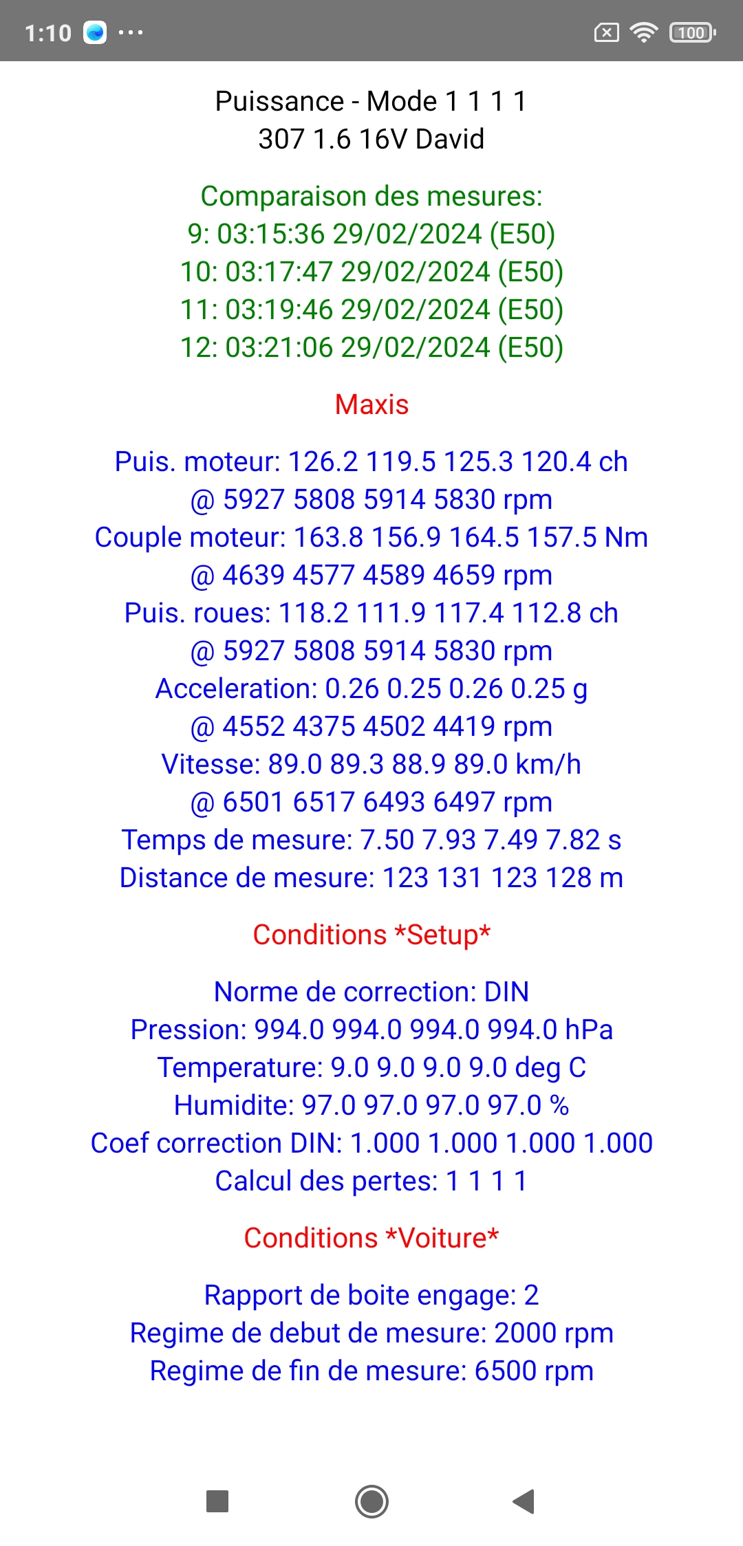 - Amplitude des puissances maxi dans un même sens <= 1% soit 1,2 ch (0,9 ch sens 1 et sens 2)