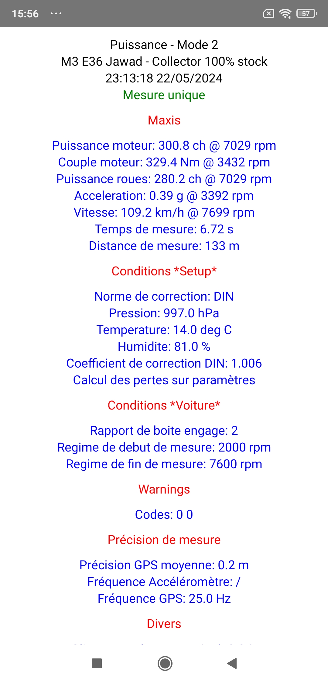 Le problème, c'est que nous avons découvert cela trop tard, sur le chemin retour après les mesures, et nous n'avons donc pas pu en refaire pour en avoir deux cliniques (sans détection de cliquetis) dans les deux sens de la route, mais nous sommes certains au vu des résultats que la 2ème mesure (sans détection de cliquetis) peut vraiment être considérée comme parfaitement représentative des résultats normaux de cette BMW M3 E36 3.2 100% d'origine, et c'est pourquoi exceptionnellement nous publions en résultats officiels les résultats d'une seule mesure!