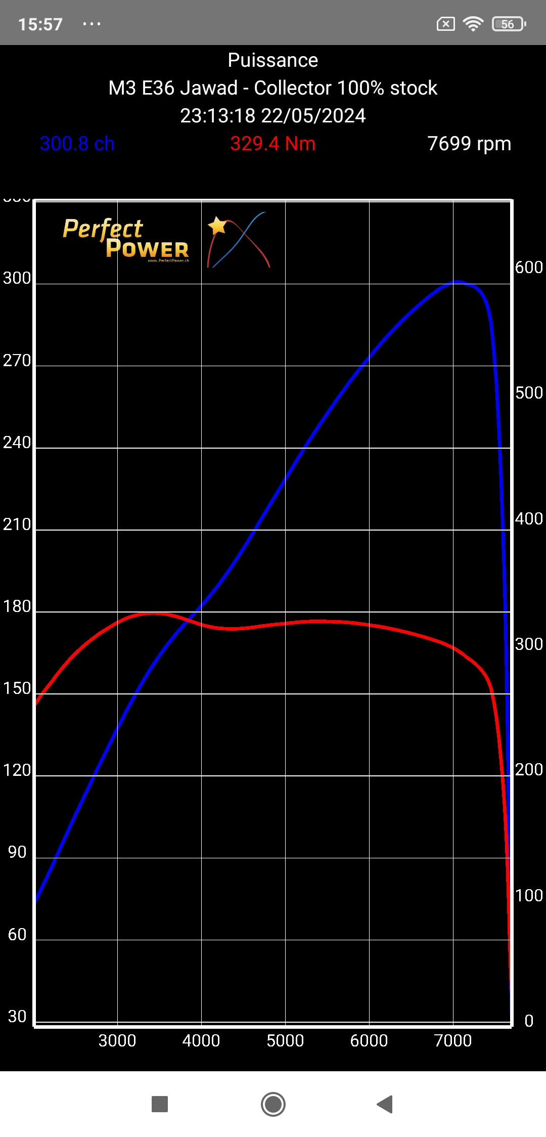 Typiquement, un S50B32 standard délivre autour de 305 ch (soit 5% pile de "perte" par rapport au S50B32 de référence BMW...), et sur cette base, nous observons des résultats certes un tout petit peu en dessous avec 301 ch soit 4 ch & 1,3% de moins, mais d'une part convenez que c'est fort peu, et d'autre part n'oublions pas qu'un doute subsiste sur la qualité de l'essence présente dans le réservoir de cette M3 au moment des mesures, et ça se trouve nous aurons une belle surprise lors des réglages finaux!