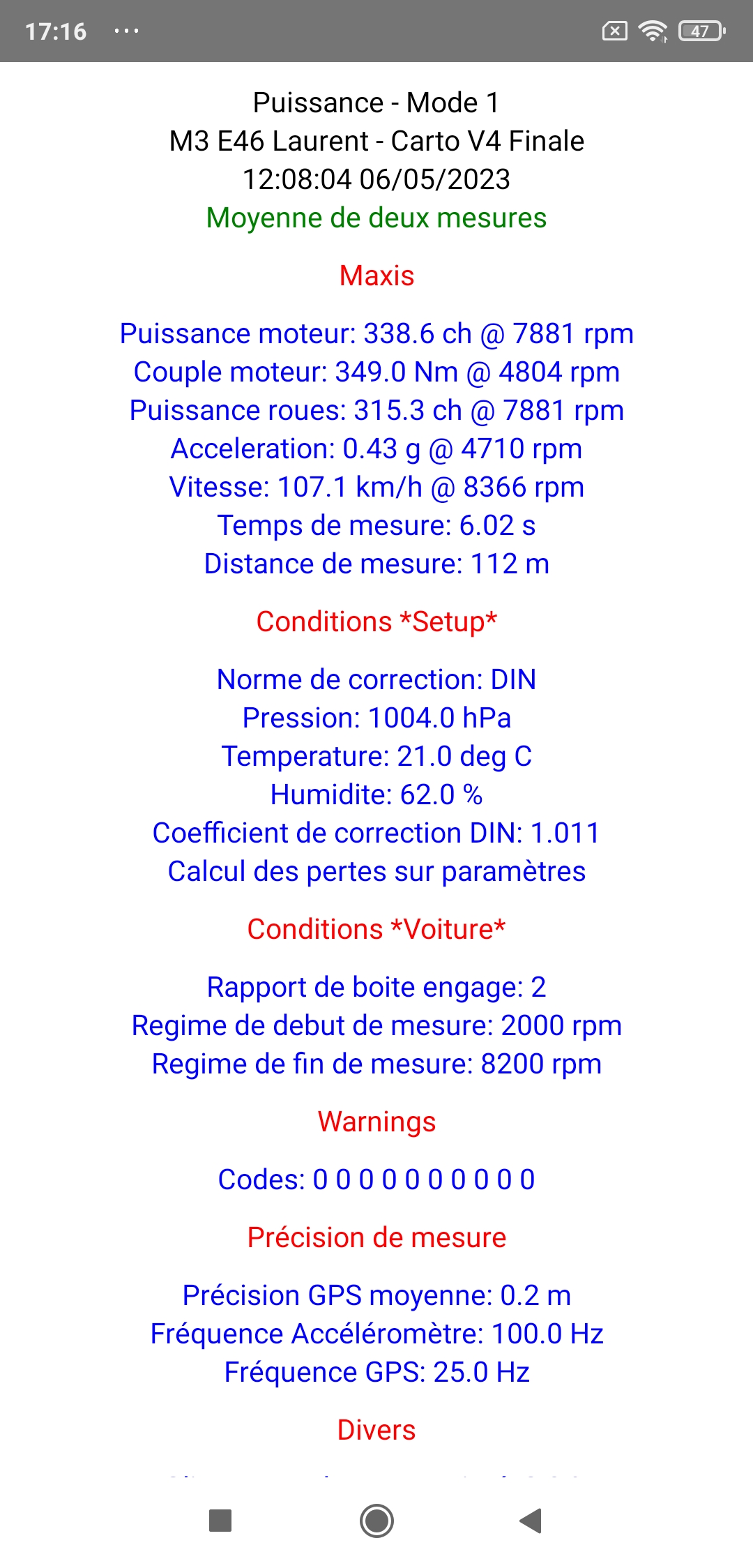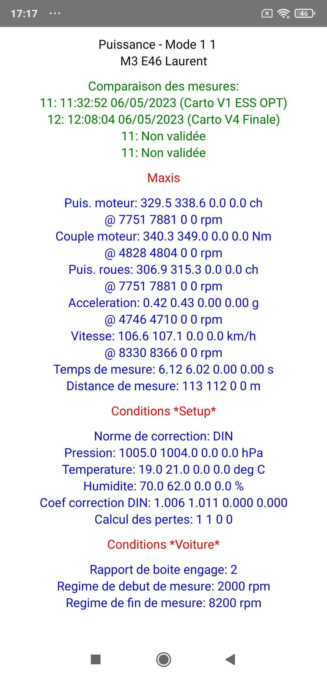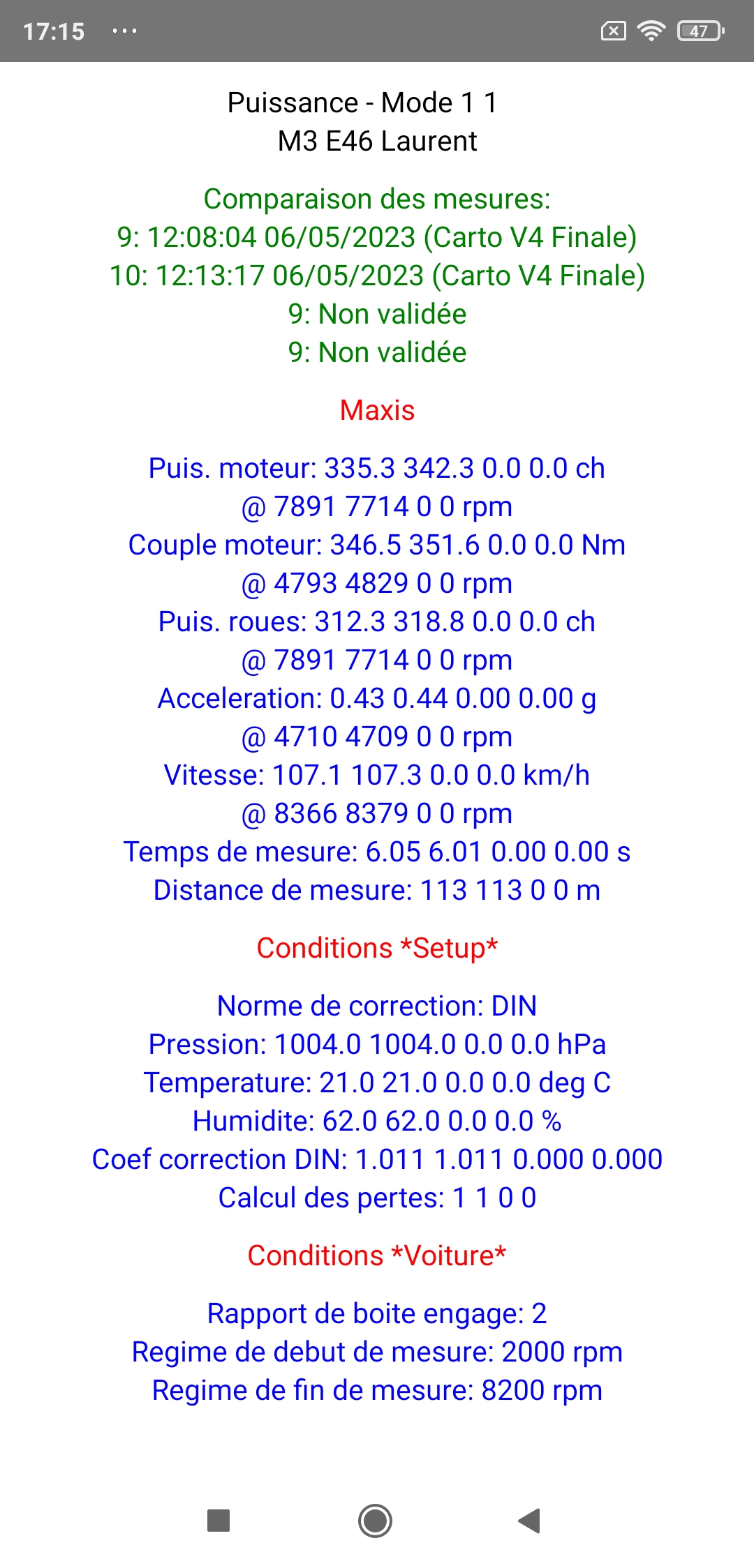 Note: Cette séance de réglages était la 1ère réalisée avec la RaceBox Mini (après des années avec le déjà excellent SkyPro XGPS 160), et la totalité des mesures réalisées a été d'une précision absolument sans faille (incluant même sur une mesure la détection d'une baisse de 5 ch entre 7300 et 8200 rpm due à une détection de cliquetis sur deux cylindres générant une forte baisse d'avance sur ces deux cylindres devant résulter en une baisse globale de puissance calculée de... 5 ch!), permettant le réglage optimal de cette M3 E46 en un temps record, encore plus court que celui que nous aurions mis sur banc si l'on prend en compte le temps (conséquent!) d'installation complète de la voiture sur le banc (centrage, sanglage, étalonnage régime, éventuel calibrage du niveau de frein, etc...): très franchement, à la seule exception du cas particulier de voitures extrêmes ne pouvant pas rouler sur route, utiliser un banc à rouleaux en 2024 ou après quand on peut utiliser le couple PerfectPower + RaceBox se montrant encore plus efficace et incomparablement moins cher ne se justifie plus, que ce soit pour une simple mesure de puissance & couple ou pour un réglage complet, et il est évident que tous les vrais passionnés et connaisseurs le comprendront parfaitement...