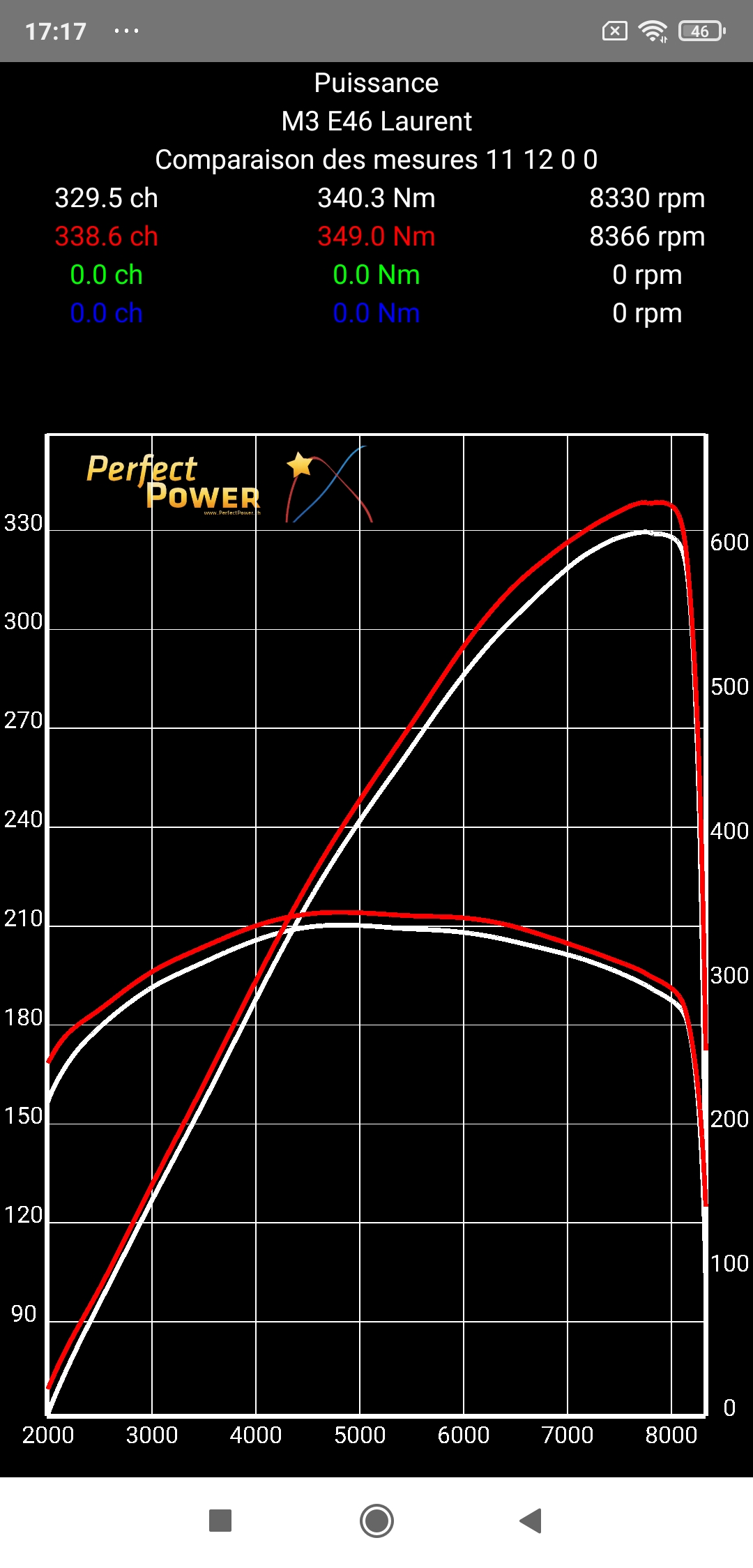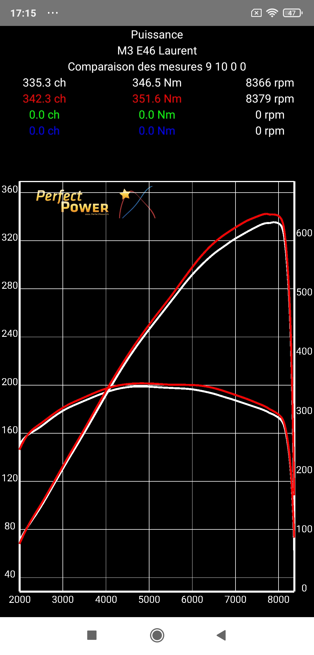 Note 3: Honnêtement la forme des courbes est non seulement superbe, mais elle est aussi extrêmement proche de celles du S54B32 de référence BMW, avec la Pmax atteinte très exactement au même régime de 7900 rpm et le Cmax atteint presque exactement aussi au même régime (4800 rpm S54B32 M3 Laurent VS 4900 rpm S54B32 BMW), mais "nos" courbes sont encore plus remplies dues à notre travail Vincent et moi où nous avons donné au S54B32 de la M3 de Laurent son rendement optimal à tous les régimes...