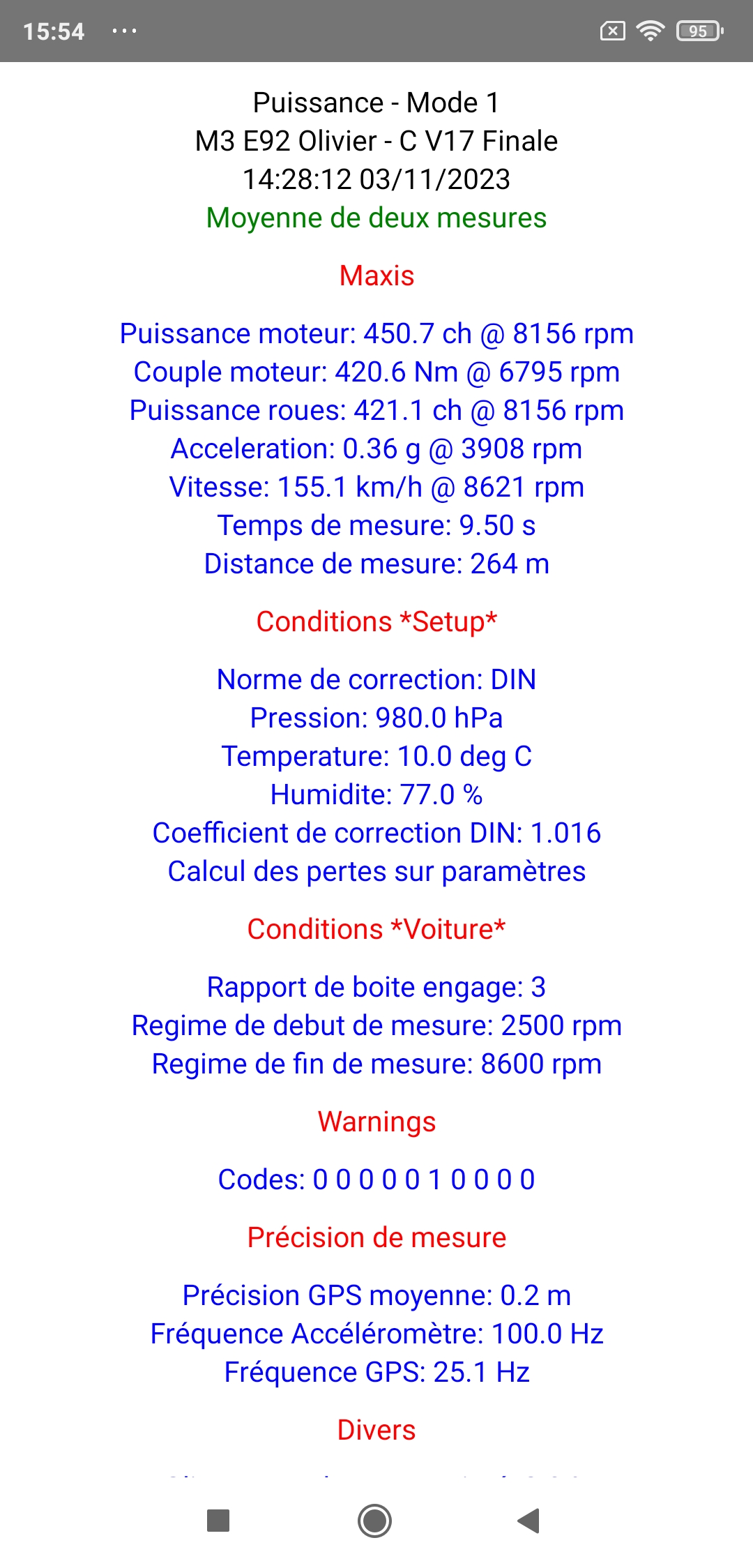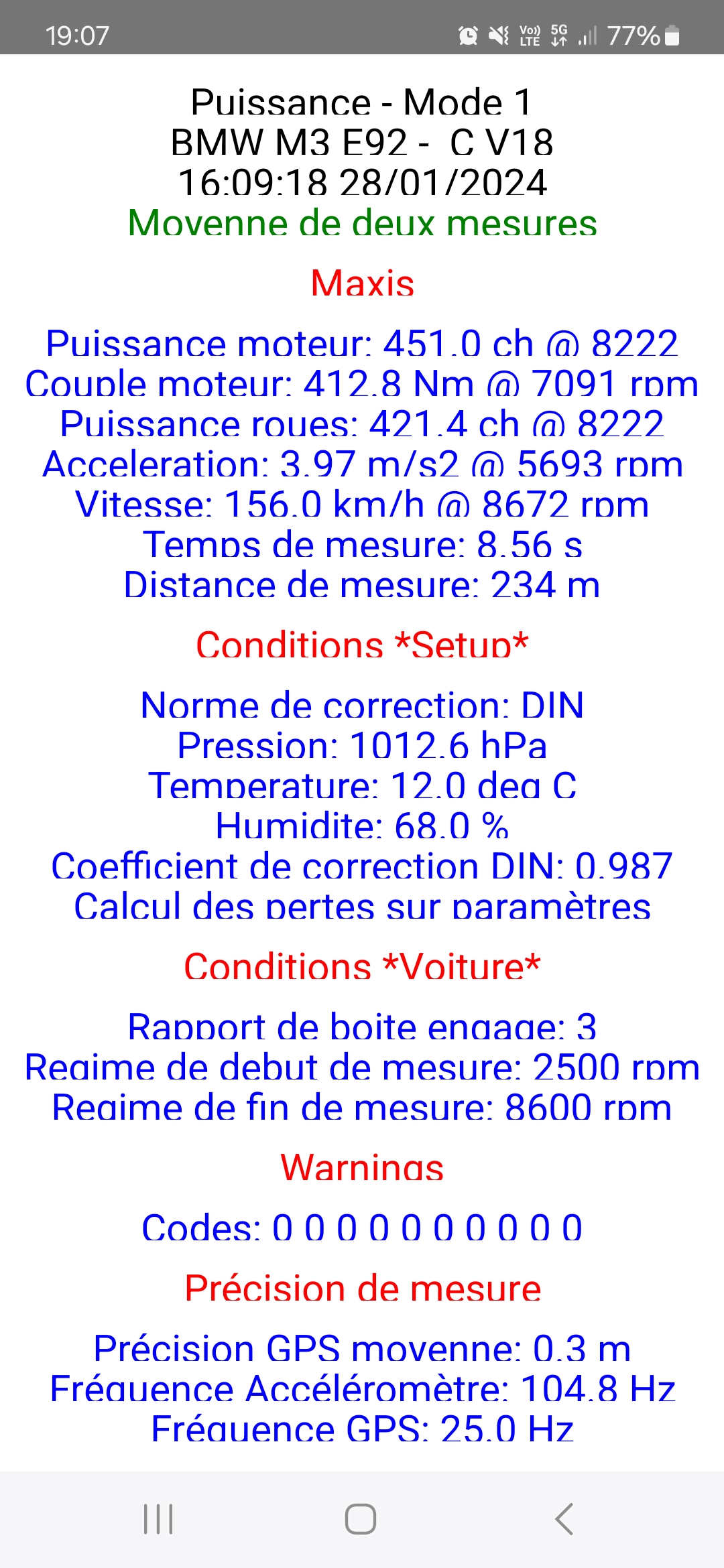 Note 2: Ce nouveau téléphone ayant été acheté bien après la séance de réglages du Vendredi 3 Novembre 2023, ces mesures ont donc été réalisées bien après celle-ci, le Dimanche 28 Janvier 2024 soit presque 3 mois plus tard, MAIS avec toujours strictement la même cartographie dans le calculateur bien évidemment (carto V17 Finale, et non la V18 marquée sur le screen qui est une erreur), ET dans exactement les mêmes conditions de mesure (en particulier la même route de mesure), à la seule exception du dosage d'éthanol un peu plus faible (E70 vérifié au lieu de E80 vérifié) ce qui est logique étant donné que l'on est en plein hiver au moment de ces nouvelles mesures, et malgré cela... les résultats sont absolument identiques (en tout cas en puissance maxi, avec seulement 0,3 ch d'écart: 451,0 contre 450,7!), comme vous pouvez le vérifier!