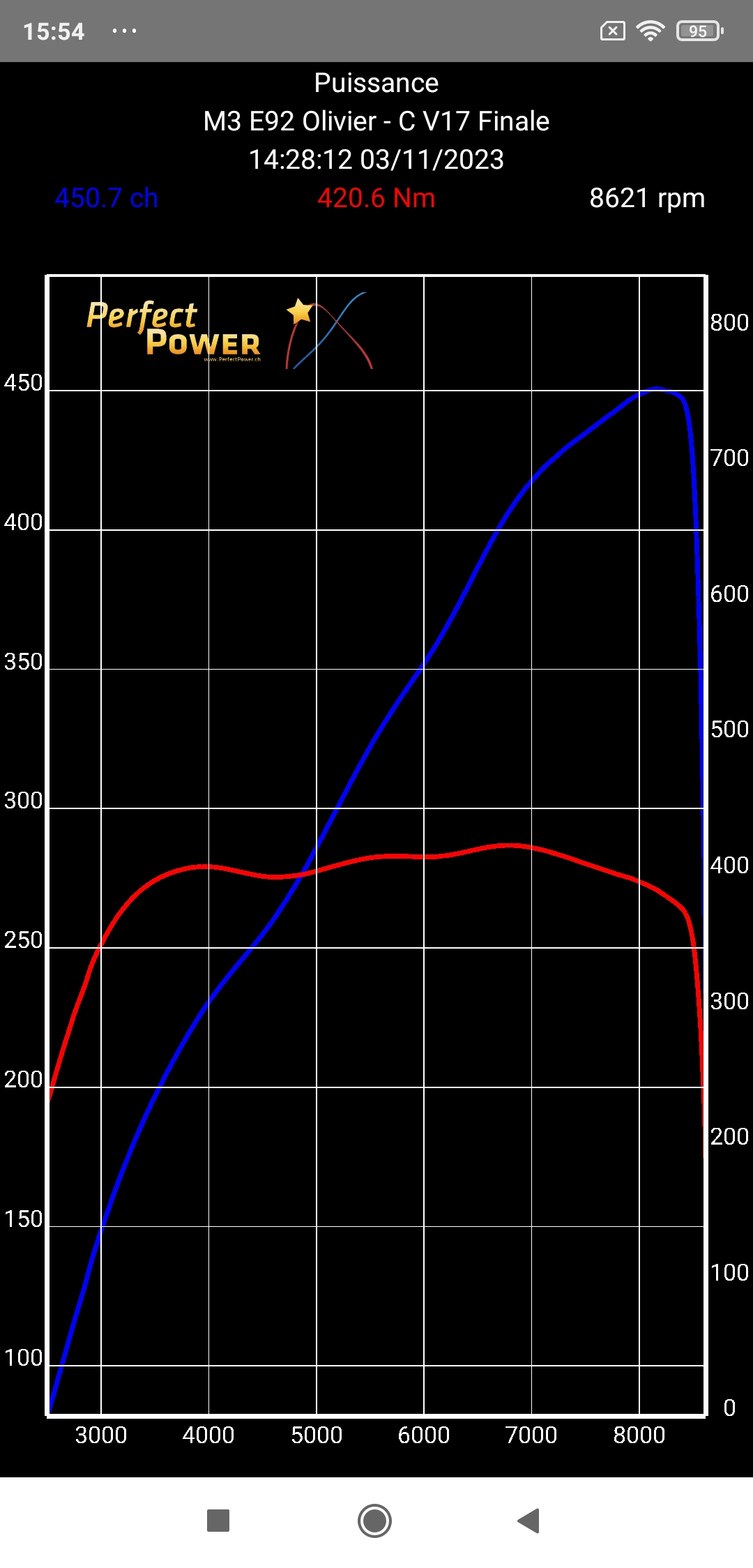 Note 2: Olivier a d'ailleurs été la faire mesurer peu après nos réglages sur un banc de référence (Maha MSR 500), un excellent banc dont je parle ICI, afin de nous accorder un nouveau comparatif PerfectPower / Banc spectaculaire, mais hélas le banc n'ayant pas été correctement paramétré (inertie véhicule excessive en mode "4 roues", et accessoirement étalonnage régime mal fait), les résultats étaient hélas optimistes (bien au delà de "nos" 450 ch déjà exceptionnels!) et nous ne pouvions donc pas publier ce comparatif! Mais une chose est certaine, c'est qu'Olivier a bien conscience des performances exceptionnelles de sa M3 E92 et de la qualité de nos réglages à Vincent et à moi, ce qui évidemment ne peut que nous faire plaisir!