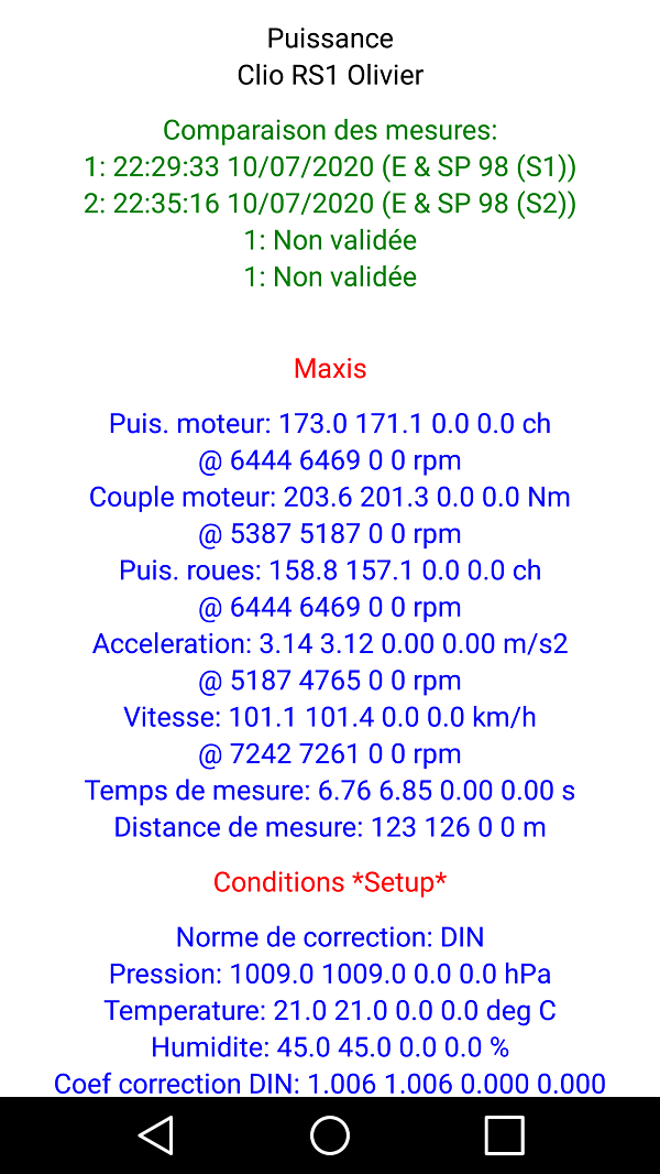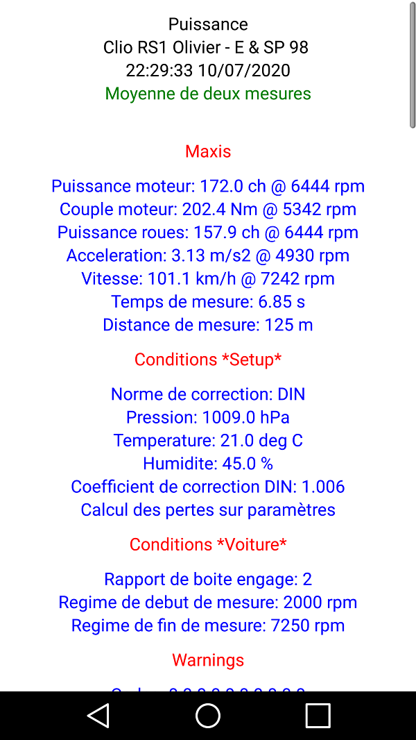 - Dans les deux sens de la route puis moyennage de ces deux mesures selon la stricte recommandation de PerfectPower afin d'éliminer les effets de pente de route et de vent (route utilisée quasi plate, 1,9 ch d'écart entre les deux sens soit une pente moyenne calculée de 0,2% en supposant une absence totale de vent)