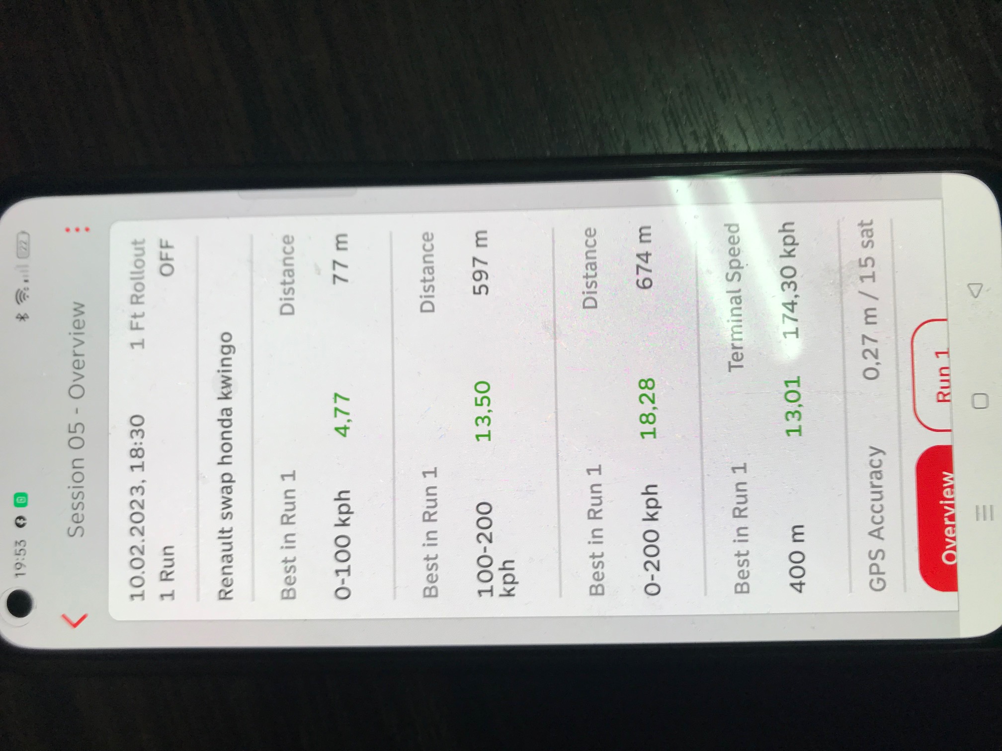 0 - 200 km/h: 18,30 s PerfectPower / 18,28 s RaceBox ==> 2 centièmes d'écart !!!